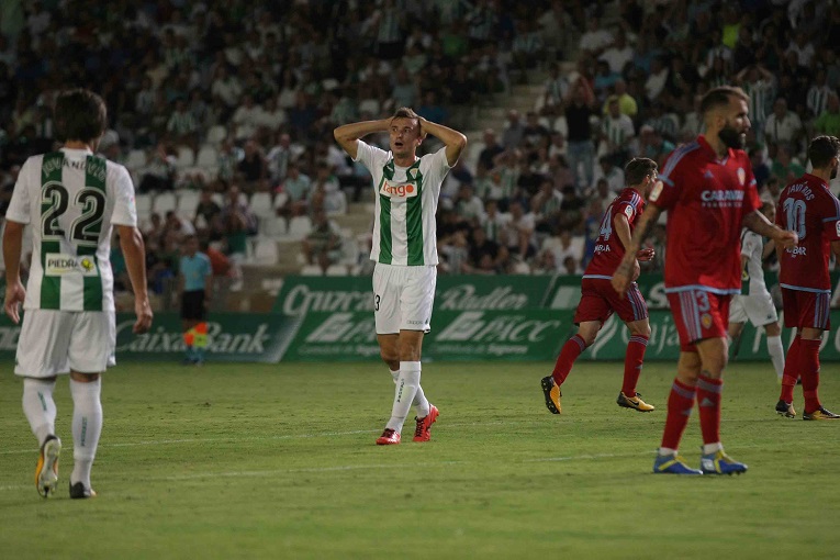 El partido comenzó con un Córdoba algo más nervioso que su rival, los locales tenían imprecisiones en los pases, debido seguramente a las ganas de agradar a su afición, mientras que los visitantes se limitaban a tocar el balón con sentido, apoderándose así de la posesión y el control en el centro del campo. Los aragoneses lo intentaban una y otra vez, pero siempre se encontraban con la defensa blanquiverde, la cual despejaba como podía. La primera ocasión la tuvo el Zaragoza tras la salida de un corner, en un barullo dentro del área, un atacante aragonés remató en el área chica a bocajarro, pero Stefanovic repelió con una gran parada. El Córdoba respondía a través del balón parado, pero no concretaba ocasiones.